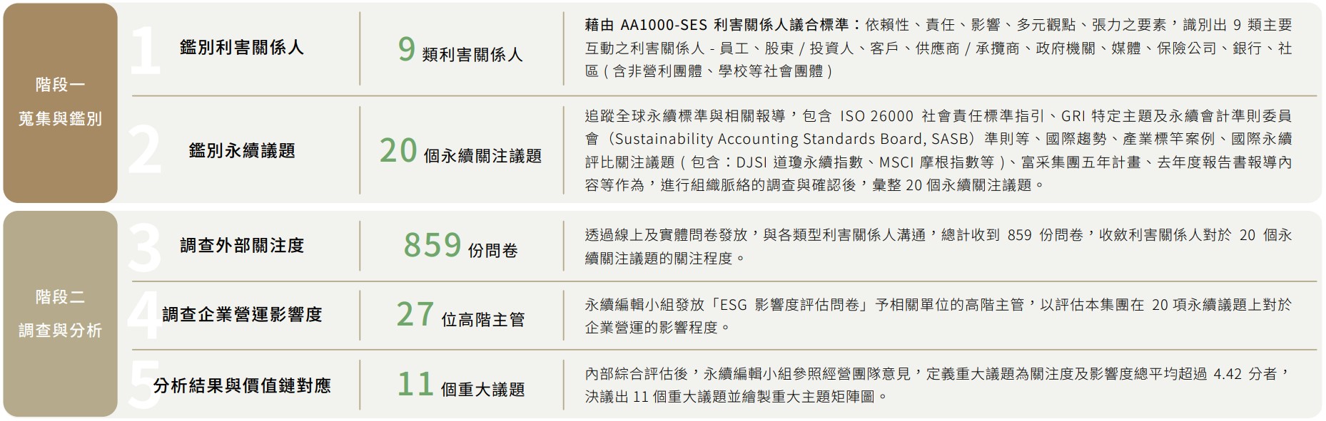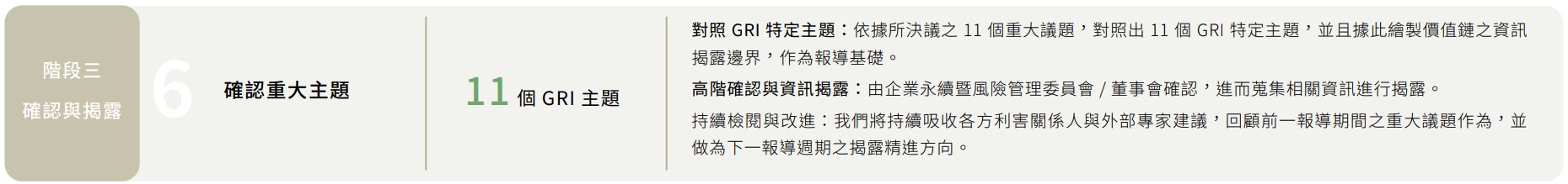 富采集團依循 GRI 永續報告標準 2021 版本進行報告書內文之撰寫,由各功能單位推 派代表組成「永續編輯小組」,成員涵蓋了企業推廣室、人資、稽核、研發、製造、 股務、環安、品保、廠務、資材等單位代表,各單位依工作屬性並參考相關產業之作法與經驗原則。我們蒐研產業相關議題,並與內外部利害關係人溝通,經內部關鍵主 管評估公司治理、社會、環境對公司產生之衝擊影響程度,並經內部研議後確認年度 重大主題共 11 項,交由企業永續暨風險管理委員會確認後進行報導。