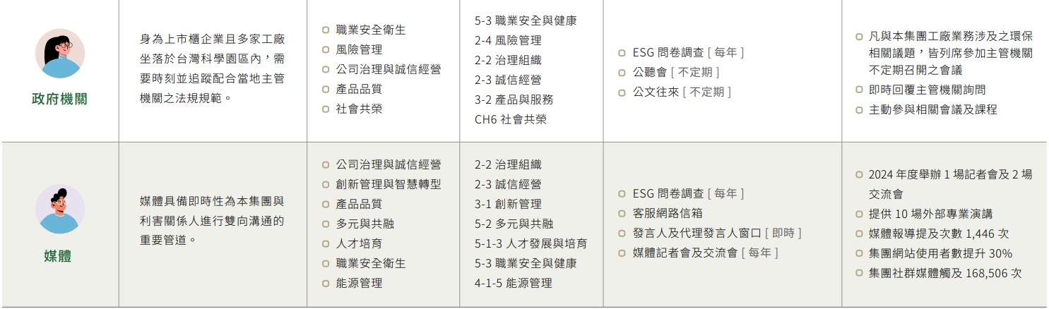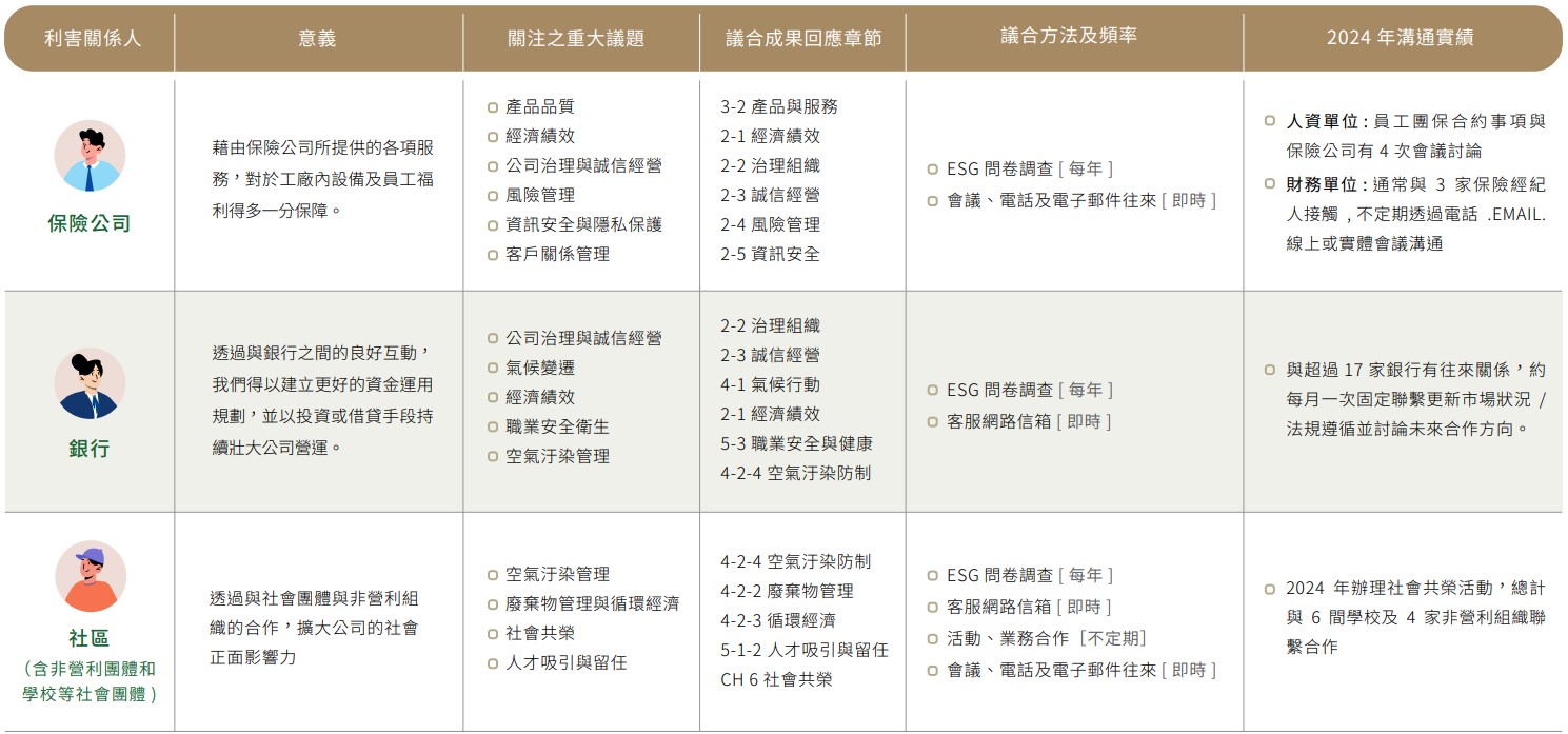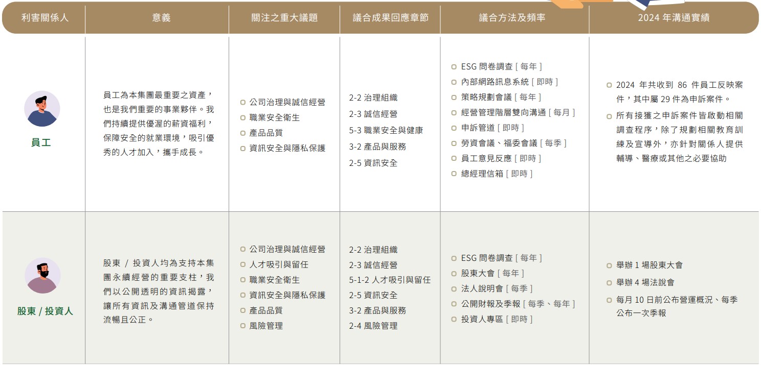 本集團於2024年共鑑別9類利害關係人:股東/投資人、政府主管機關、媒體、員工、保險公司、客戶、供應商/承攬商、銀行、社區(含非營利團體及學校等社會團體),同步揭露於當年度ESG報告書與集團ESG官網,並每年定期一次於董事會報告與各利害關係人溝通情形。對於其所關注的永續主題、溝通管道與回應方式、及溝通頻率皆訂定執行做法。
