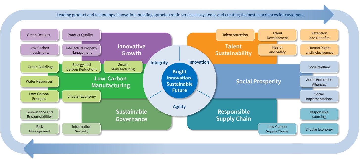 The Ennostar Group began implementing sustainability and ESG actions in 2022. Our vision in business is to become the “best compound semiconductor investment platform” through our focus on four core concepts (Innovation, Integrity, Inclusiveness, and Sustainability) and extension of six major sustainable development aspects. Our parent company has established a dedicated sustainability department which continues to plan and execute Group sustainability transformations; coordinate short, medium, and long-term plans; and gradually achieve the two main missions of our sustainability strategic blueprint. We hope our proactive management of climate risks, strengthening of sustainable development, and incorporation of investor ESG expectations and needs can reduce environmental impacts while enhancing quality of life and enabling continued generation of profits. We utilize the advantages and resources of our subsidiaries to expand our social influence and create a virtuous cycle of sustainability.