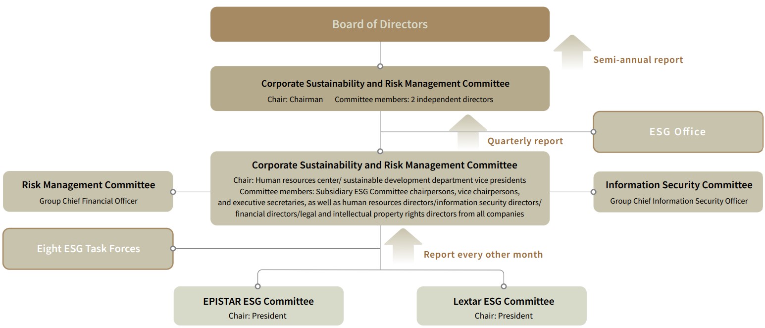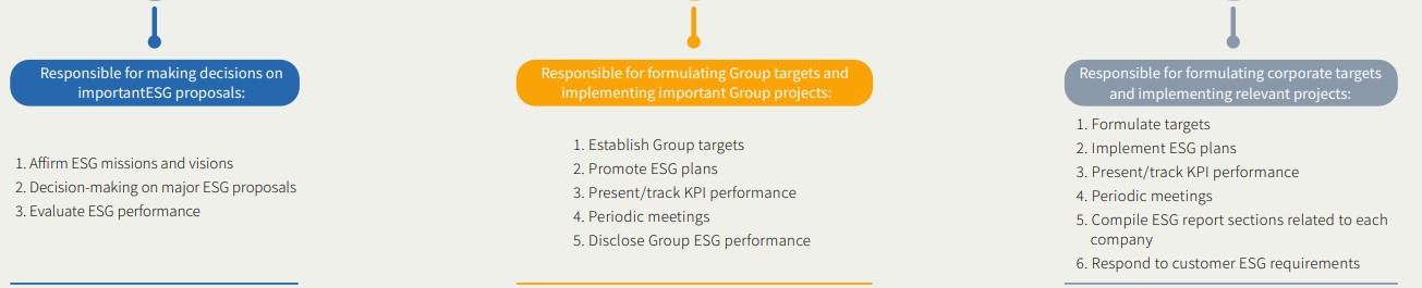 The Group’ s Corporate Sustainability and Risk Management Committee operates on four levels, with the Board of Directors serving as the highest governance and decision-making unit. We believe that ESG actions should be implemented not only through top-down directives, but also through encouragement of bottom-up proposals. Therefore, we have established an open bidirectional communication channel for joint achievement of goals, and strive to implement sustainability blueprint targets in the Group. We focus on Group targets, identify important projects, formulate related measurement indicators, and horizontally integrate subsidiary resources to jointly promote sustainable transformations.