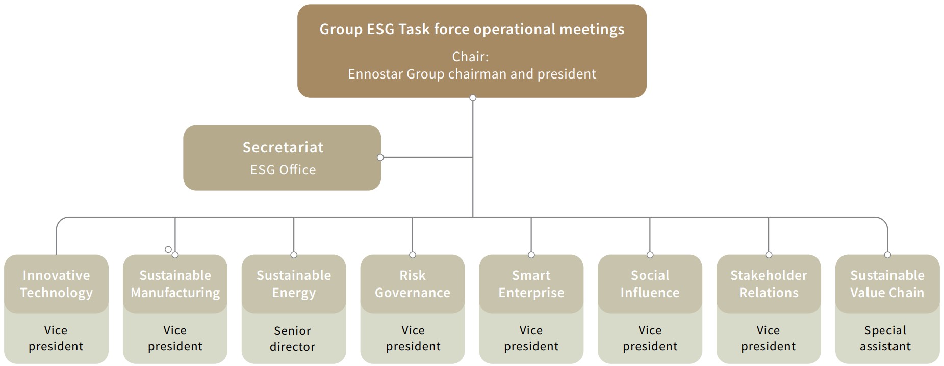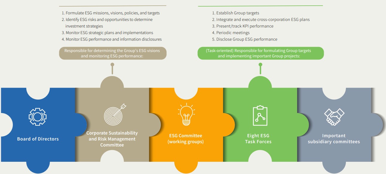 To accelerate horizontal and cross-enterprise integration of various Group sustainability issues, we oicially established eight ESG Task Forces in the third quarter of 2022, and these task forces oicially commenced operations in 2023. The task forces are chaired by the Group president and chairman, and senior executives from our main subsidiaries lead each cross-enterprise task force in implementing Group projects. Physical meetings are convened every quarter to report progress on Group projects. These task forces enable the Group to lead all subsidiaries in making strides toward low-carbon production, innovation and growth, sustainability governance, talent sustainability, social prosperity, and sustainable supply chain goals. We have also formulated strategic blueprints aligned with international net zero trends to further ensure that our ESG strategies are fully implemented in the Group’ s routine operations.