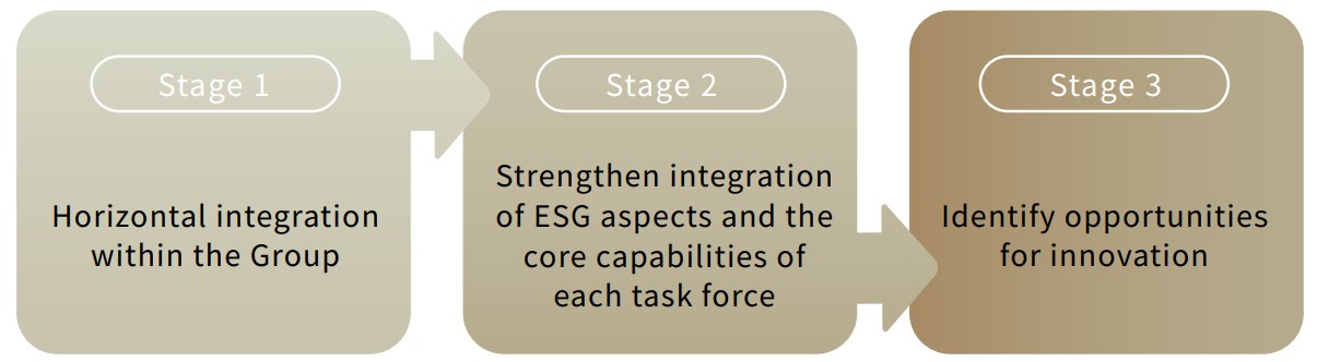 The Group strengthens sustainability through six major actions (targets, projects, our Sustainability Institute, ESG reports, our corporate website, and activities). We firstly focus on Group targets, identify important projects, formulate related measurement indicators, and horizontally integrate subsidiary resources. Internally, we have established a Sustainability Academy which offers various ESG courses taught by professional external speakers, hosts related activities, and compiles ESG columns for internal subsidiary publications so that our colleagues can be immersed in an atmosphere infused with ESG concepts. Externally, continued exposure through the media and regular publication of sustainability reports help us communicate with our stakeholders. In future, we will integrate ESG performance with our rewards systems to incorporate ESG concepts into routine tasks for all departments and make ESG a part of our corporate DNA.