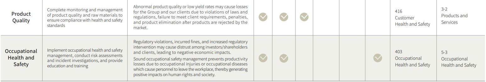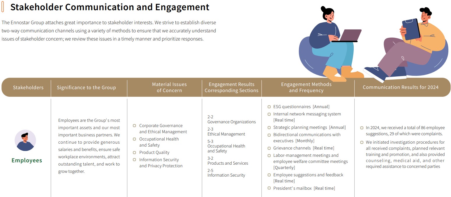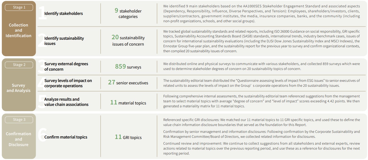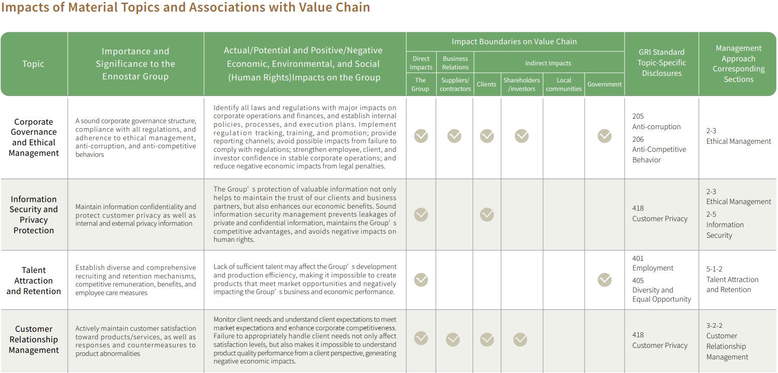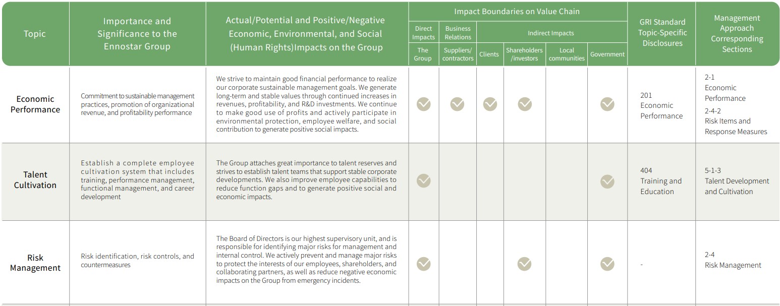 The Ennostar Group compiled this Report in accordance with the 2021 GRI Sustainability Reporting Standards. A “Sustainability Editorial Team” composed of representatives from all functional units, including our corporate communications oice and human resources, auditing, R&D, manufacturing, shareholder aairs, environmental health and safety, quality assurance, factory aairs, and materials departments. All units adhered to business characteristics and referenced industrial practices and principles. We collected information on industry-related issues and communicated with internal and external stakeholders. Key internal managers assessed corporate governance, social, and environmental impacts: The 11 material topics for the year were determined following internal discussion, and these issues were submitted to and confirmed by the Corporate Sustainability and Risk Management Committee before reporting.