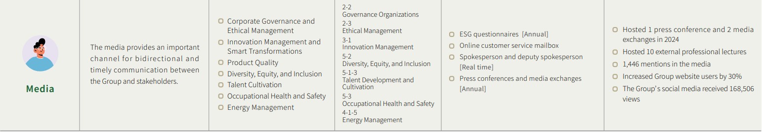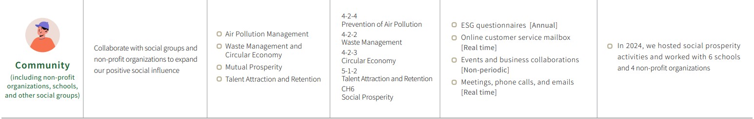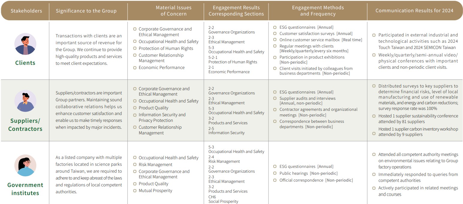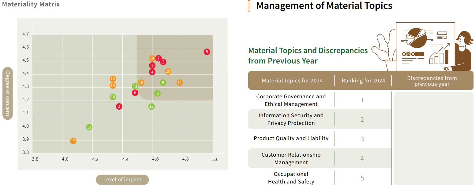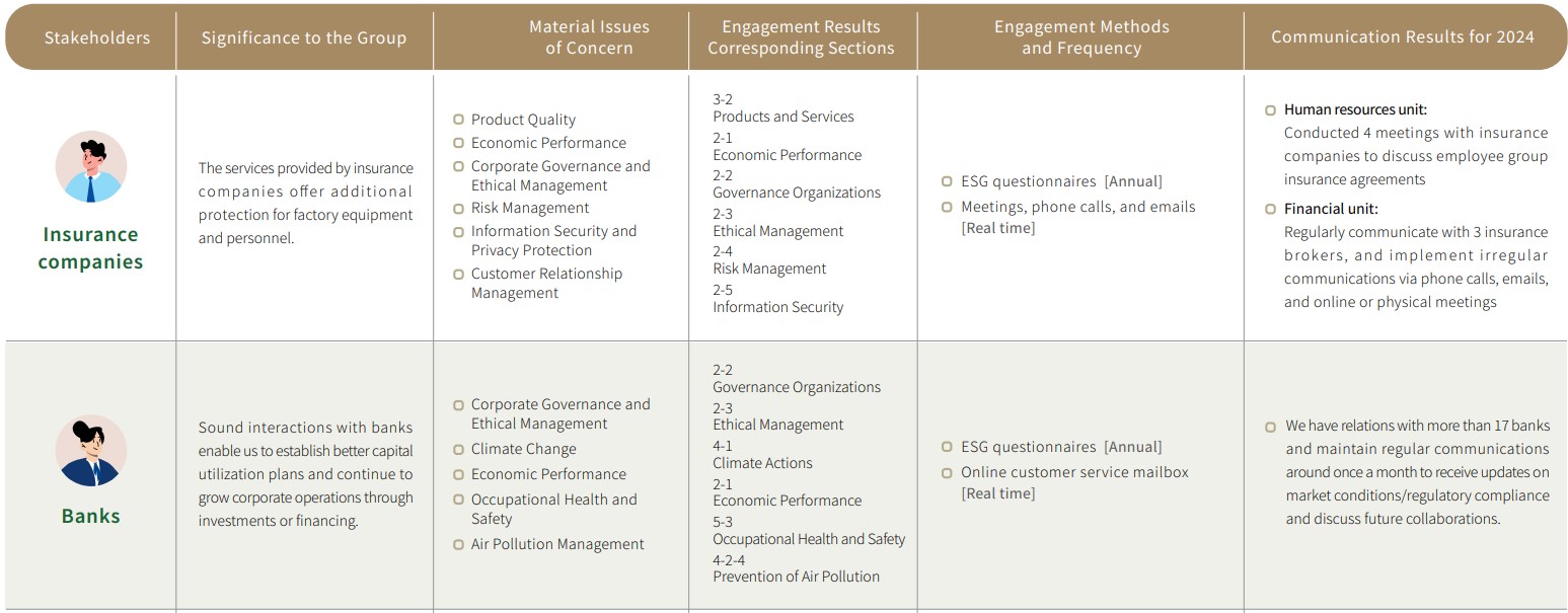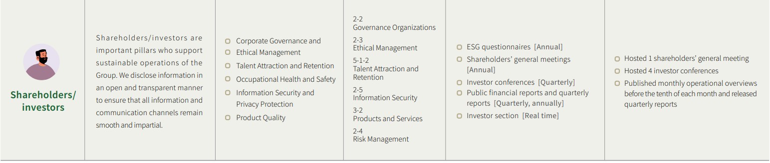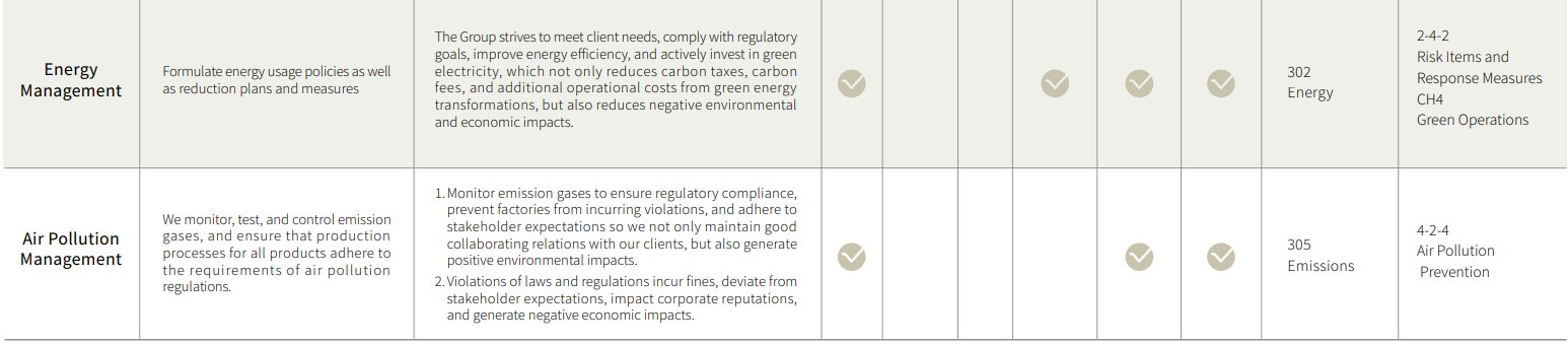 The Ennostar Group compiled this Report in accordance with the 2021 GRI Sustainability Reporting Standards. A “Sustainability Editorial Team” composed of representatives from all functional units, including our corporate communications oice and human resources, auditing, R&D, manufacturing, shareholder aairs, environmental health and safety, quality assurance, factory aairs, and materials departments. All units adhered to business characteristics and referenced industrial practices and principles. We collected information on industry-related issues and communicated with internal and external stakeholders. Key internal managers assessed corporate governance, social, and environmental impacts: The 11 material topics for the year were determined following internal discussion, and these issues were submitted to and confirmed by the Corporate Sustainability and Risk Management Committee before reporting.