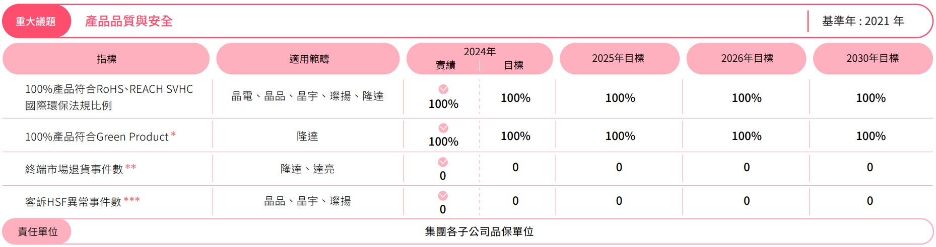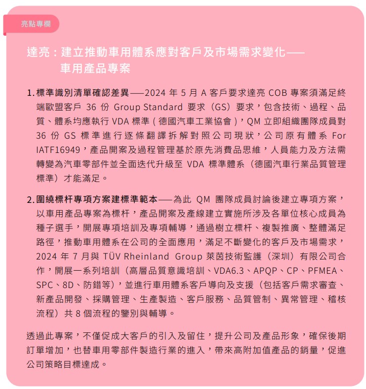 本集团皆已取得品质管理系统 ISO 9001、IATF 16949 外部验证;隆达、达亮另皆 取得 ANSI/ESD S20.20,并分别取得 ISO 26262、ISO/IEC 17025 外部验证。同时, 隆达与达亮自 2024 年起推动导入 VDA 6.3 ,进行内外部教育训练、亦培训四十四 人取得 VDA 内部稽核员证书, 强化车用产品管理;同时推动数位及智慧工厂管理, 透过部门协同合作,将智慧品质管理观念融入产品生命周期流程,透过智慧控制有 效管理品质异常问题、透过管理优化将效益极大化。于长期规划推动设备平准化 /专线生产、并持续精进国际车用产业标准,车用产品品质最佳化。