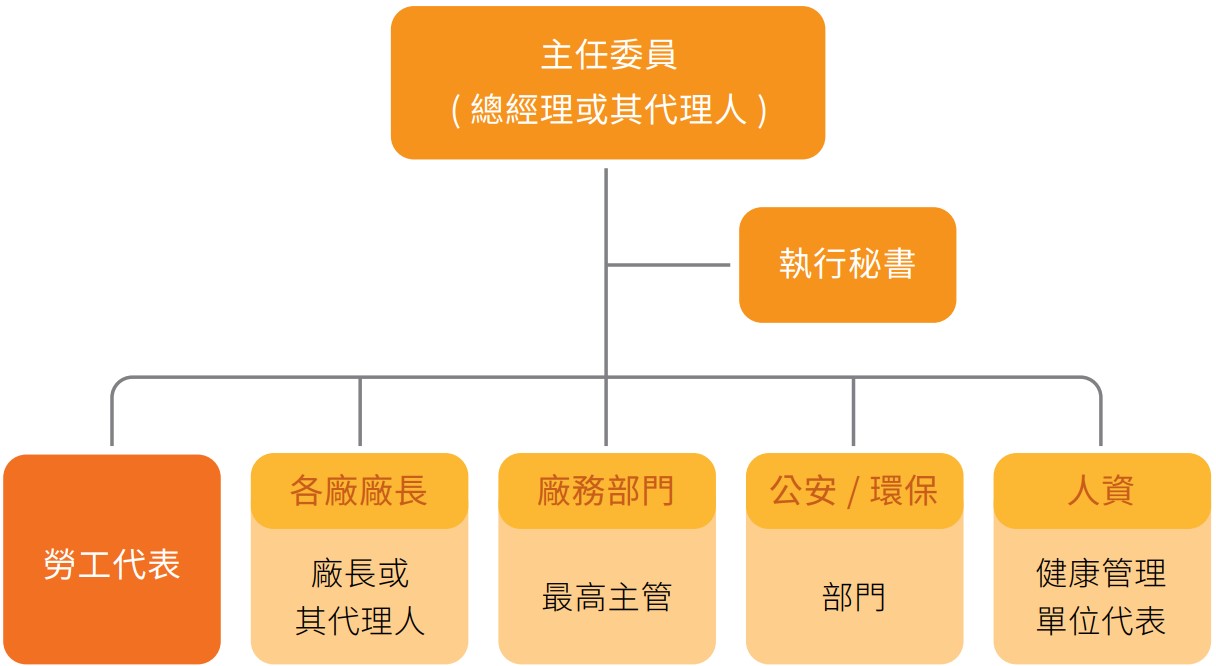 集團 ESH 委員會由總經理或其代理人於每季召開,各廠區則於每月由廠長主持召開 廠區層級 ESH 委員會,所研議之結論適用各自廠區。所屬組織包括委員 ( 各廠廠長 或其代理人,研發、支援、品保及人資中心最高主管、環安部門 )、勞工代表 ( 佔委 員人數之三分之一以上,換算約 33%)。