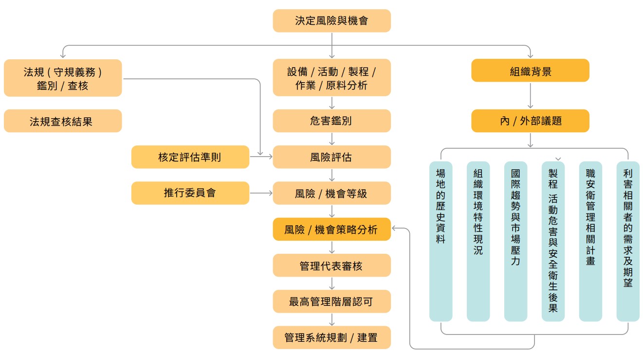 本集團制定重大危害辨識與風險評估管理程序,以風險評估技術分析可能導致異常 之潛在風險,並採取控制預防手段,降低危害發生機率及嚴重度。安全衛生危害分 析依各部門之活動 / 製程 / 類別 / 範圍內之步驟 / 機器設備 / 工作項目等作業步驟, 針對物理、化學、生物、人因工學、社會性及其他危害分類,估計其發生率、暴露 率及嚴重性鑑別出風險與機會之步驟。