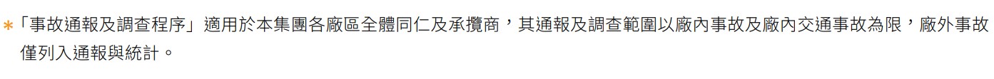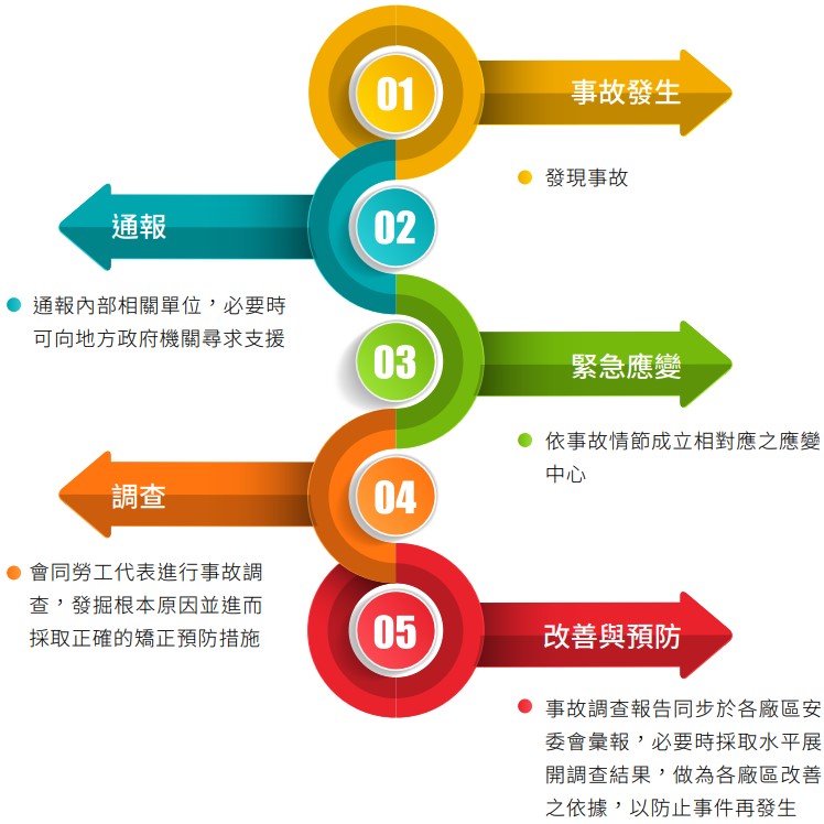 本集團重視同仁工作安全,如遇異常事故發生,於第一時間迅速完成通報並啟動緊急應 變機制,以降低人員傷害與營運損失為目標。事故發生後,依公司所建立之「事故通報 及調查程序 * 」,會同勞工代表進行事故調查,發掘根本原因並進而採取正確的矯正預 防措施,事故調查報告同步於各廠區安委會彙報,必要時採取水平展開調查結果,做 為各廠區改善之依據,以防止事件再發生。