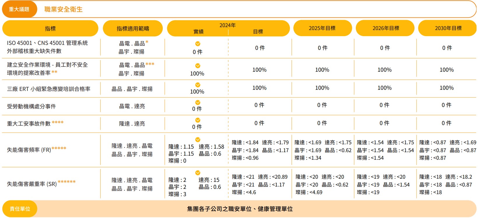 本集團各子公司皆建立環境管理審查暨職業安全衛生委員會 (Environment, Safety and Health committee, 以下簡稱 ESH 委員會 ),研議及協調有關安全與衛生暨環保 之相關事務,訂定目標、推動持續改善計劃。設置完善的承攬商管理辦法、危害辨識 與風險評估、事故調查與緊急應變程序。我們更以嚴謹的職安衛教育訓練、緊急應變 演習和危害告知講習,強化員工與承攬商的安全風險意識。