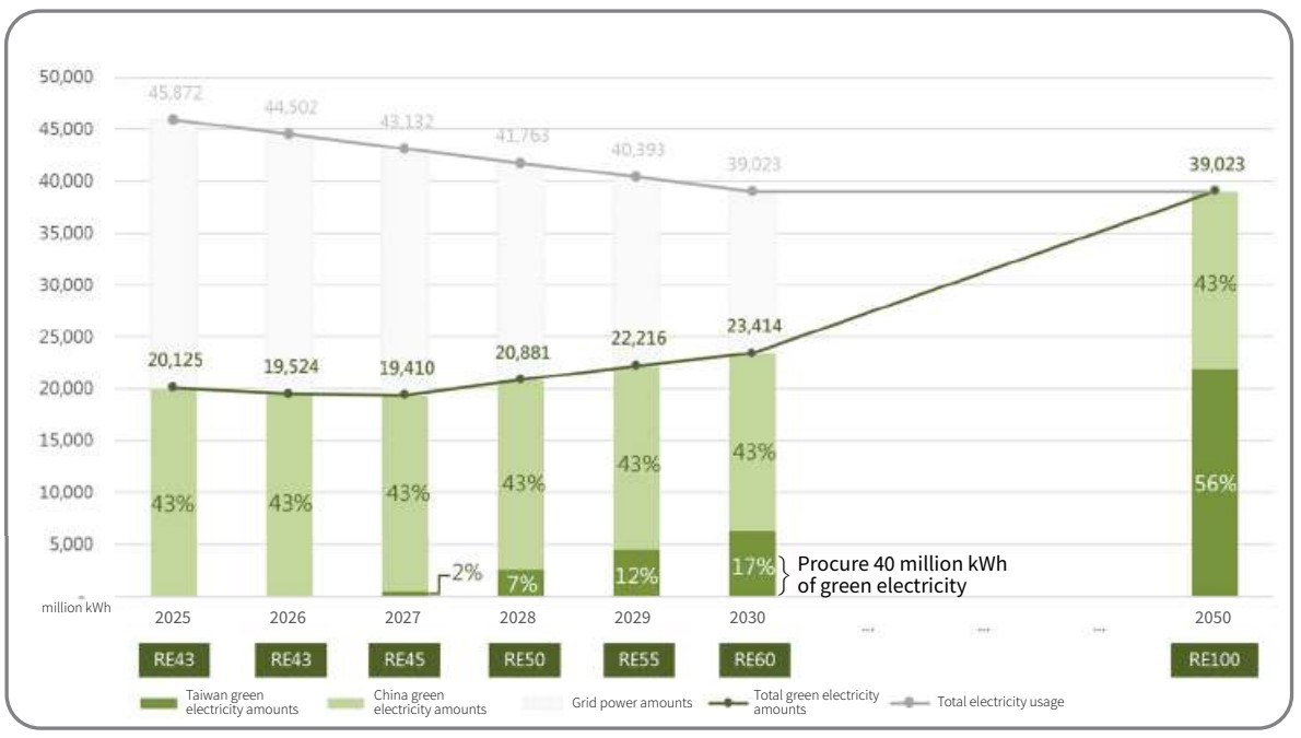 1. Actively signed power purchase agreements: All of our factories in China achieved 100% renewable energy usage starting in 2025, and we estimate that the Group’ s overall renewable energy ratio will reach 43% as a result. Our factories in Taiwan continue to sign power purchase agreements (PPAs) and aim to gradually increase use of renewable energy starting in 2027 to achieve our goal of 100% renewable energy usage by 2030.