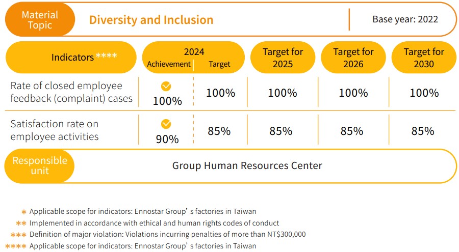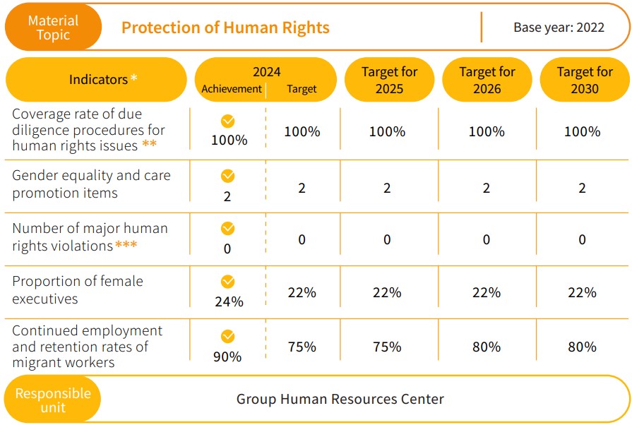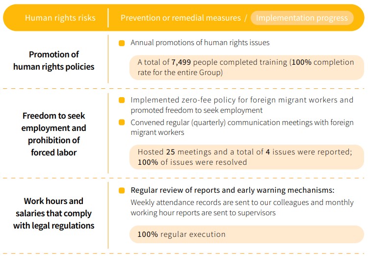 The Group’s Human Resources Center jointly formulated human rights policies in three languages which were released on all Group corporate websites following approval by our chairman; these policies are applicable to all Group corporations, including all employees and operational activities, and we also require compliance with these standards from our suppliers, outsourcing vendors, contractors, clients, and other value chain partners. The Group adheres to the “United Nations Global Compact,” “Universal Declaration of Human Rights,” “United Nations Guiding Principles on Business and Human Rights,” “Organisation for Economic Cooperation and Development Guidelines for Multinational Enterprises,” “Social Accountability International (SAI),” “Responsible Business Alliance (RBA),” and other relevant labor laws and international human rights standards. We have established human rights regulations to ensure protection of human rights in all operational activities as well as compliance with employment laws and international standards.