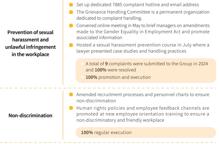 The Group regularly organizes annual “human rights policies” courses and tests for all Group personnel. Our human rights education and training in Taiwan were attended by 4,204 participants, achieving a training completion rate of 100%. The courses covered gender mainstreaming, sexual harassment prevention, gender equality, labor laws, and the Labor Standards Act, ensuring that our employees understand our corporate human rights policies and mitigating human rights risks. We also disseminate information on human rights policies and demonstrate our emphasis on human rights through non-periodic newsletters to enhance employee awareness of human rights issues.