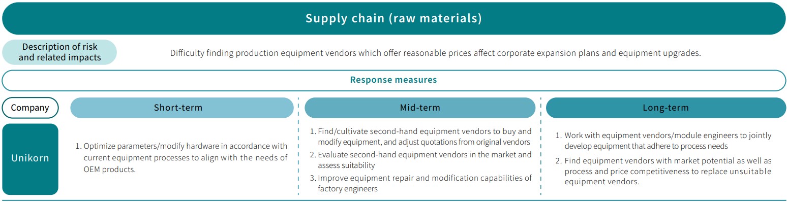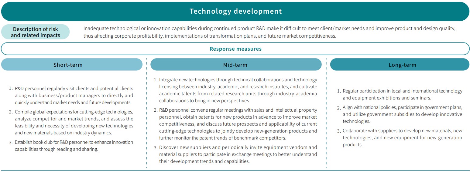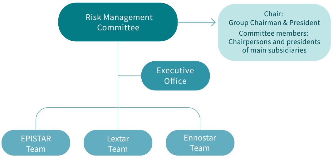 To protect the interests of employees, shareholders, partners, clients, and other internal and external stakeholders, the Ennostar Group adheres to international risk management guidelines; the Board-approved “Risk Management Policies and Procedures” serves as our highest guideline for risk management. The Group adheres to established risk management policies and actively established a risk management framework including systems and processes which define various risks based on corporate operational strategies. We built mechanisms for early identification, assessment, accurate measurement and response, eective supervision, and strict control of operational risks, as well as mechanisms for internal risk reporting and response, forming a comprehensive internal risk management system framework that embeds risk management culture into daily operations and enhances business resilience. We combine these mechanisms with annual systemic assessment and identification of material risk topics to help our management team make decisions, continually improve best practices for risk management, enabling us to create and enhance corporate value as we fulfill our commitment to corporate sustainability.