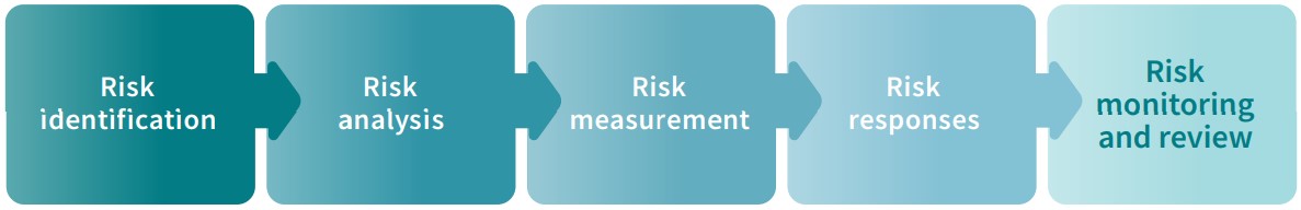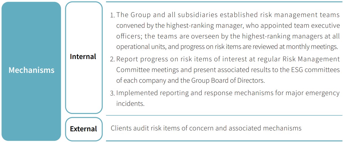 Our risk management processes are based on corporate strategic goals and risk management policies, and encompass risk identification, analysis, measurement, response, supervision, and review. The Group conducts comprehensive risk identification processes at least once a year, compiles past experiences, and assesses possible risks in future operations. Our senior executives conduct identification of key and emerging risks, and the business units of major subsidiaries also conduct risk identification activities and disclose identified risks and management achievements. We analyze potential impacts from risk events based on risk assessment results, and then formulate risk response strategies as well as prevention, warning, response, crisis management, and business continuity plans to mitigate, transfer, and avoid risks. Finally, we confirm risk supervision and review mechanisms to ensure that our risk management procedures operate eectively, and include risk response plans in performance measurements and reports, which are compiled and reported to the Sustainability & ERM Committee by the Risk Management Team every six months to continue improving risk management implementation benefits and enhance overall operational decision-making.