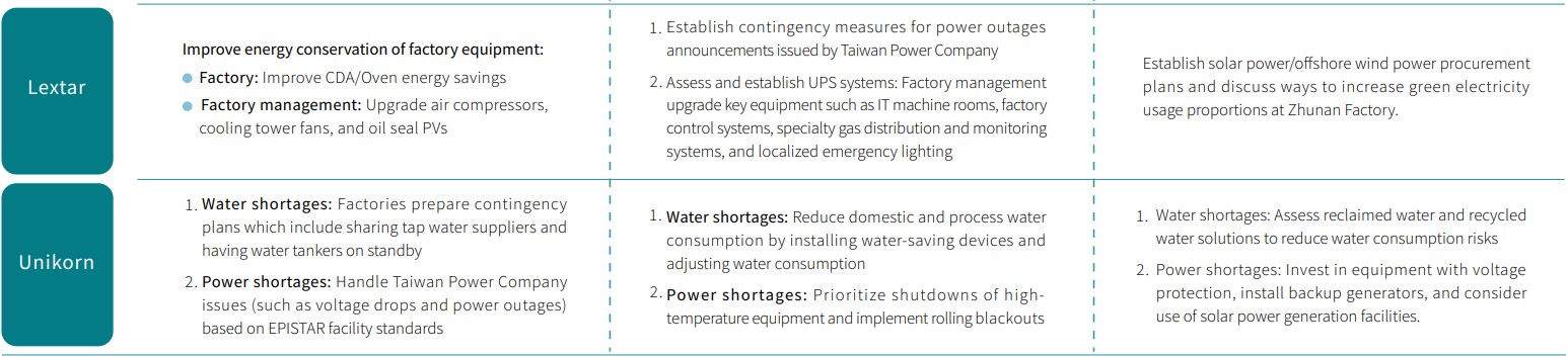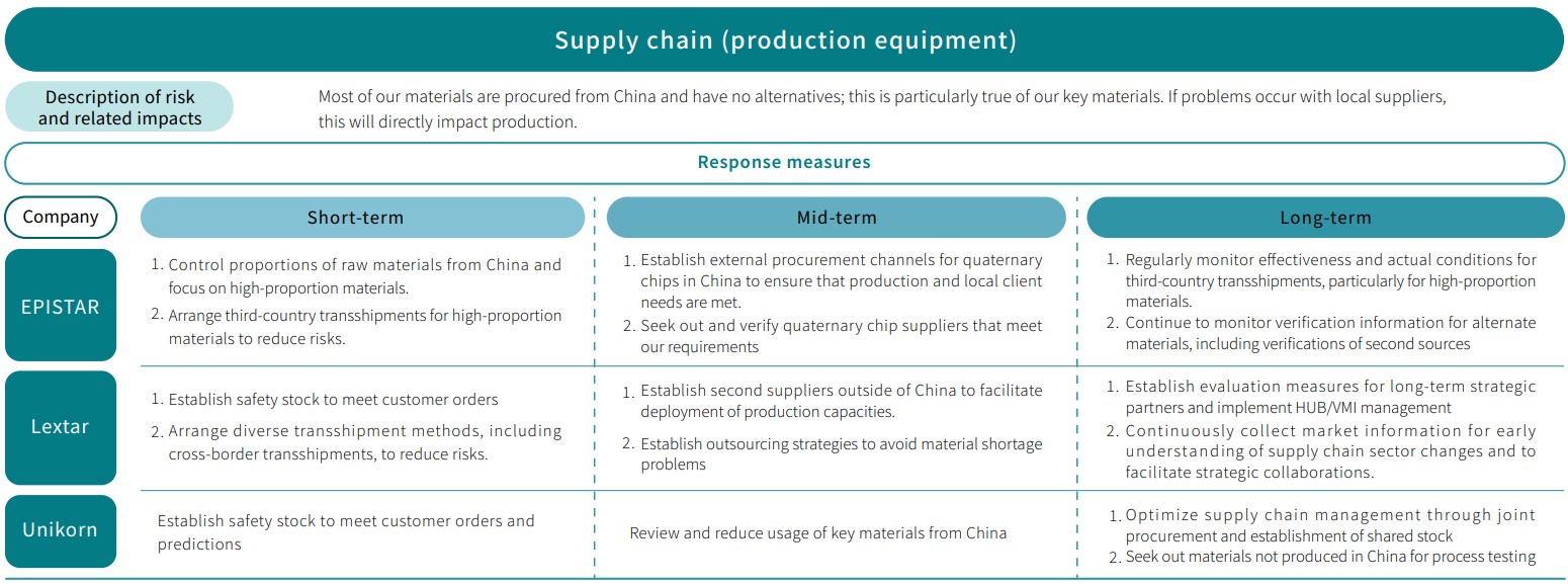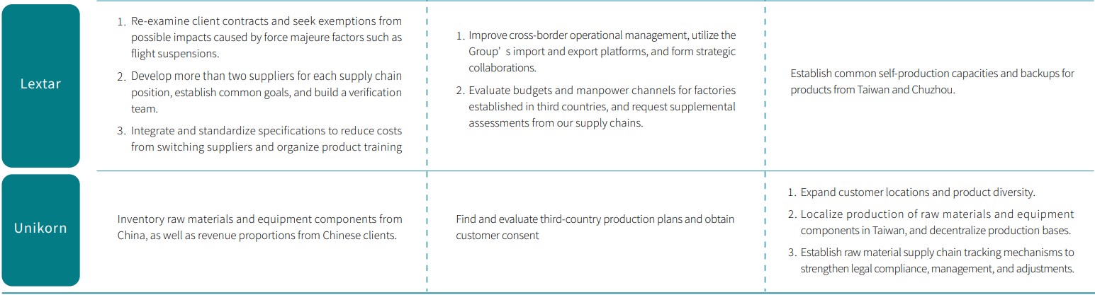 - Ennostar and subsidiaries EPISTAR and Lextar hosted one risk management team meeting each month (a total of 36 monthly meetings) where executive secretaries worked with other unit managers to supervise and track progress on risk projects.
