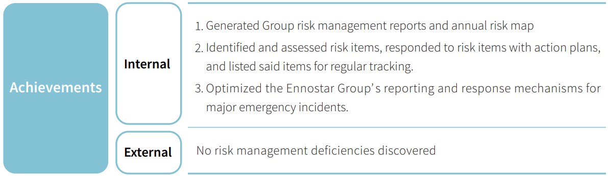 - Completed Ennostar Group advanced risk management interim and final reports (one meeting for each report), 3 Risk Management Committee meetings, and the Ennostar Group advanced risk map calibration meeting (a total of 3 meetings, including meetings for subsidiaries).